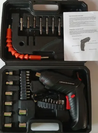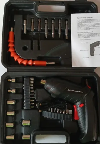 Maletín de destornillador a batería con un total de 47 piezas. - Incluye destornillador eléctrico. - Extensor flexible. - Diversas puntas y vasos. - Estuche organizador.