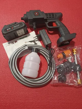Pistola de agua a presión portátil con batería recargable. - Incluye batería de 21V. - Manguera de conexión. - Cargador de batería. - Boquillas intercambiables. - Ideal para el lavado de motos,caravanas,Camper,bicicletas,etc.