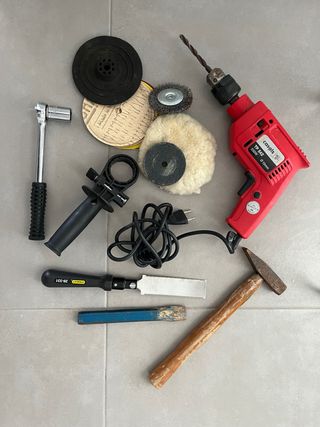 Se vende caja con herramientas usadas. Incluye un taladro Casals TP 542 de 500W y 10mm, en buen estado. También se incluyen varios accesorios: - 2 discos de pulido. - 2 cepillos metálicos. - 1 llave de vaso. - 1 mango para herramienta rotativa. - 1 sierra de mano. - 1 cincel. - 1 martillo. - Cable