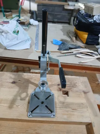 Soporte para taladro de columna, ideal para trabajos de precisión. - Base metálica con orificios para fijación. - Columna vertical ajustable. - Palanca para descenso del taladro. Ojo ver todas las fotos tiene una rotura en la parte del tornillo para apretar tope pero se puede apretar bien