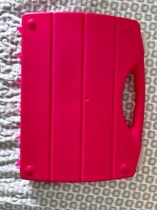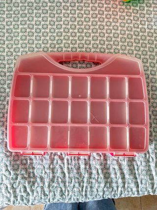 Maletín rojo de plástico con distintos compartimentos. Tiene una pequeña raja en la parte superior, pero no está roto ni se sale nada. Los separadores se pueden sacar para hacer los compartimentos más grandes.