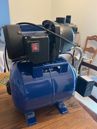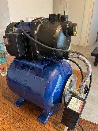 GRAN OPORTUNIDAD!! Bomba eléctrica de superficie con calderín integrado. Muy poco uso (está como nueva). Bomba para aguas limpias con calderín para funcionamiento como grupo de presión. Adecuada para proveer de presión a circuitos domésticos de riego o abastecimiento de agua. El calderín permite tener una reserva de presión y reduce el número de veces que tiene que arrancar la bomba. - Características especificadas en la última foto.