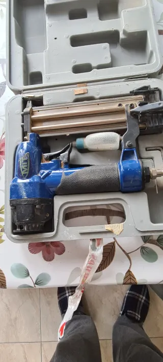 Se vende lote de dos herramientas neumáticas. - Herramienta principal de color azul. - Incluye un pequeño recipiente blanco. - Se vende en su maletín de transporte gris.
