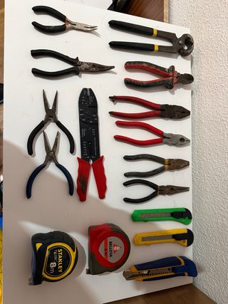 Conjunto de herramientas manuales para diversas tareas. - Alicates de punta fina - Alicates de corte - Pelacables - Pinzas - Cúter (verde) - Cúter (amarillo) - Cúter (azul y amarillo) - Cinta métrica Stanley (8m) - Cinta métrica Bellota (8m)
