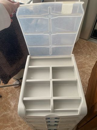 Carrito organizador de plástico blanco y azul con ruedas, ideal para almacenar herramientas o cualquier tipo de objeto. - Estructura de plástico resistente. - Cuatro cajones transparentes. - Ruedas para fácil movilidad. Recogida en fuenlabrada