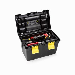 Caja de herramientas de plástico resistente, ideal para organizar y transportar tus herramientas. - Color rojo y negro. - Asa para fácil transporte. - Cierre de seguridad.