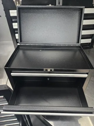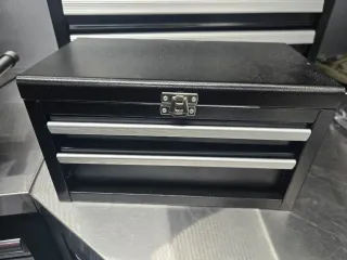 Pequeña caja de herramientas metálica de color negro con tres cajones. Medidas 270x150x150mm - Diseño compacto. - Acabado metálico. - Cierre de seguridad.