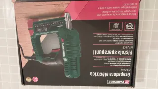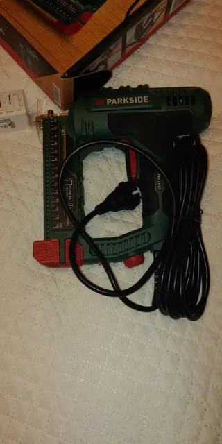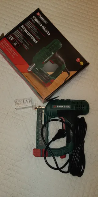 Grapadora eléctrica de la marca Parkside. Diseñada para un uso cómodo y eficiente. El carro se encasquilla un poco cuando tiene muchos clavos. Tiene bastante fuera aun - Color verde y negro. - Empuñadura ergonómica. - Cable de alimentación incluido.