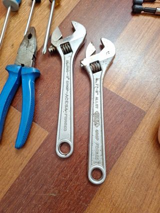 Conjunto de herramientas manuales variadas, incluyendo llaves inglesas y destornilladores. - Llave inglesa REGA 8 Alloy Drop Forged. - Llave inglesa ACESA 3 Drop Forged. - Alicates con mangos azules. - Varios destornilladores.