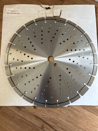 Disco de corte laser ventilado con un diámetro de 350mm. - Diseño ventilado para mejor refrigeración. - Borde con segmentos de diamante para corte. - Agujero central para montaje en sierra. Disponible 2 unidades 100€ cada uno Obras, construcción, reformas