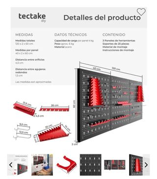 Panel de herramientas Tectake DIY con soportes. - 3 paneles de herramientas. - Incluye 25 soportes. - Material de montaje y instrucciones. - Capacidad de carga por panel: 4 kg. - Peso aproximado: 6 kg. - Material: acero. - Medidas totales: 120 x 2 x 60 cm. - Medidas por panel: 40 x 2 x 60 cm. - Distancia entre orificios: 4,5 cm. - Distancia entre agujeros redondos: 1,5 cm. Arañado