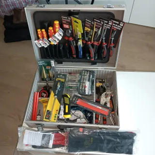 Completa caja de herramientas de bricolaje de la marca Parkside, Stanley sdy etcContiene una gran variedad de herramientas manuales. - se compone de 30 piezas - Destornilladores de diferentes tamaños. - Alicates de corte, punta y universales. - Llave inglesa ajustable. - Cutter y cúter. - Cinta métrica. - Brocas para taladro - juego de puntas de diferentes tipos - guantes y gafas de protección etc - diferentes marcas . Todo nuevo sin usar - solo la caja de aluminio 50 euros y las 30 piezas a menos de 4 ,30 piezas.