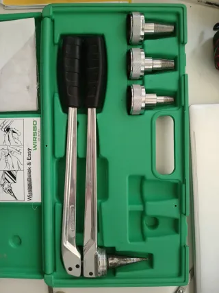 Herramienta manual para expandir tuberías Wirsbo. Incluye el cuerpo principal de la herramienta y varios accesorios. - Cuerpo de la herramienta con mangos ergonómicos. - Juego de expansores de diferentes tamaños. 16 - 20 - 25 - Estuche de plástico verde para almacenamiento y transporte. Nuevo Sin uso. Valido para tubo Wirsbo. UPONOR. BARBI. PRESSMAN. ETC
