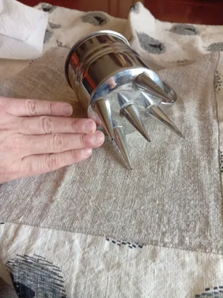 Utensilio de cocina/pastelería, acero inoxidable con un diseño único. - Fabricado en acero inox. - Cuenta con surtidores de clara o yema de huevo - Posee un asa lateral. - Diseño con bandas circulares.