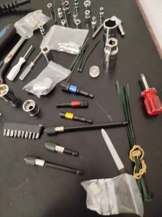 Lote de herramientas variadas, ideal para reparaciones y proyectos. - Incluye destornilladores de diferentes tamaños. - Juego de llaves de vaso. - Alicates y tijeras. - Accesorios varios para herramientas.