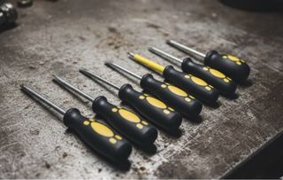Conjunto de herramientas manuales y accesorios varios. - Mango ergonómico de goma y plástico. - Varillas metálicas de diferentes puntas. - Diseño con detalles en amarillo.