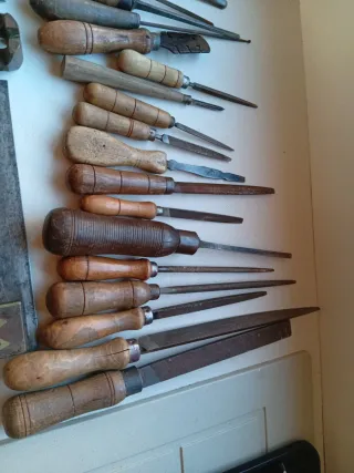 Conjunto de herramientas de carpintería antiguas, ideales para coleccionistas o aficionados. - Variedad de formones y gubias con mangos de madera. - Cepillo de madera. - Sierra de mano. - Calibre de metal. - Escuadra de carpintero.