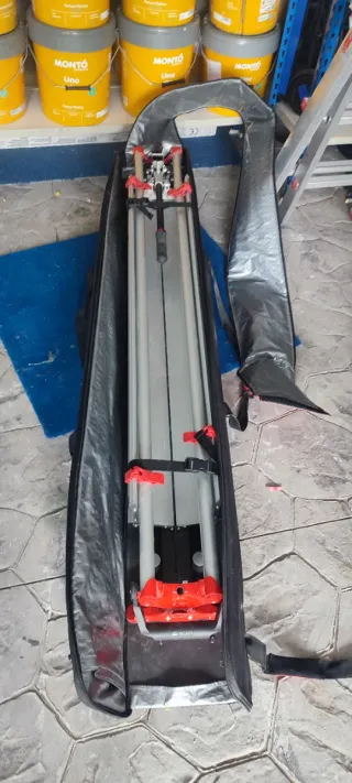 Cortador de azulejos manual marca Rubi, modelo TZ-1550. Incluye su funda de transporte. - Longitud de corte: 155 cm. - Corte en diagonal. - Base de aluminio. - Incluye juego de ruedas de repuesto.