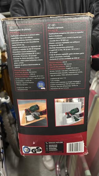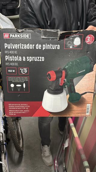 Pulverizador de pintura Parkside PFS 400 B1, ideal para pinturas, barnices y esmaltes. - Potencia: 450 W. - Longitud del cable: 3 m. - Apto para viscosidades de hasta 70 DIN-seg. - Incluye diferentes formas de chorro ajustables.