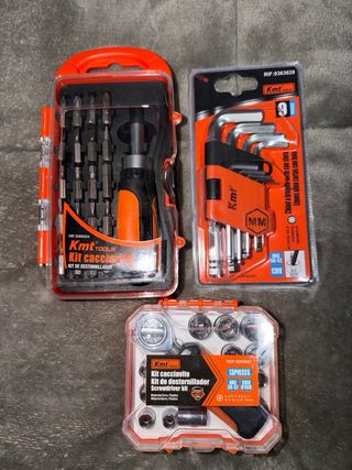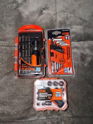 Se vende lote de dos kits de herramientas de la marca Kmt Tools. - Kit de destornillador con 21 piezas. - Kit de llaves Allen con 9 piezas. - Kit de carraca pequeña con 13 piezas. Se puede vender también por separado.