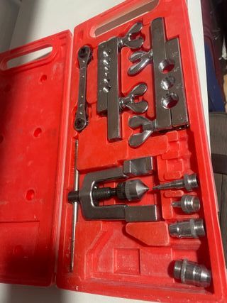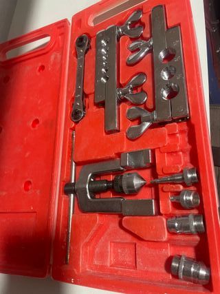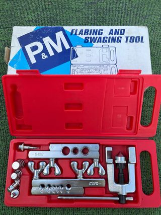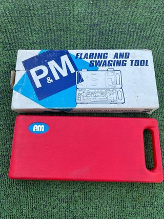 Se vende kit de herramientas para abocardado y repujado de la marca P&M. -Está en perfecto estado y se conserva en su caja original. -Incluye una práctica maleta roja para su transporte y almacenamiento. - Ideal para trabajos de aire acondicionado. - Contiene varias piezas para diferentes tamaños de tubos. - Herramienta en perfecto estado de conservación.