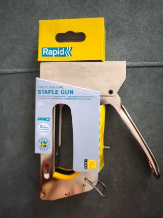 Rapid grapadora profesional R33 PRO para grapas n⁰13. Perfecta para tapicería, textiles pesados, alfombras, cuero, lonas etc. Gatillo y empuñadura ergonómicos, fabricada en Suecia en acero. Nueva, precio no negociable.