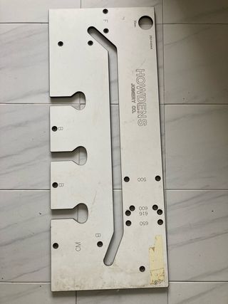 Plantilla de carpintería de la marca Howdens. - Marcada con medidas y guías para taladros. - Incluye referencias 'F', 'B', 'CM', '30mm', '500', '600', '616', '650'. - Modelo 260-44844. 100cm x 40 cm