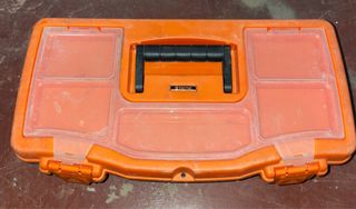 Caja de herramientas con tapa naranja y base negra. - Tapa con asa integrada. - Compartimentos en la tapa.