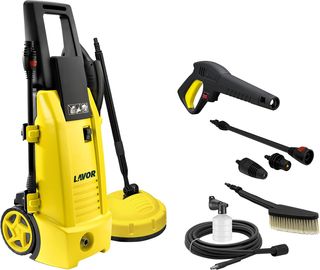 Hidrolimpiadora de alta presión Lavor LVR4 con motor de 2100W. Incluye manguera, pistola, lanza y varios accesorios. - Diseño compacto y robusto. - Ruedas para facilitar el transporte. - Enrollador de manguera integrado.