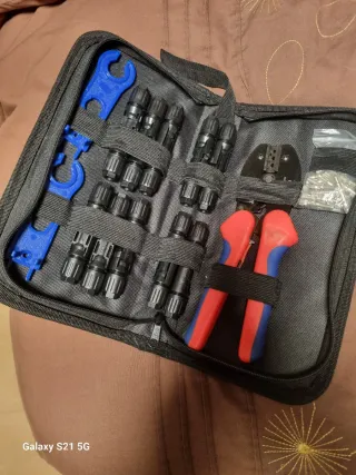 Kit completo para la instalación y mantenimiento de conectores solares. - Incluye alicates de crimpado. - Herramienta de llave para conectores. - Conectores solares MC4 (varias unidades). - Funda organizadora.