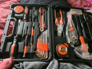 Set de herramientas manuales para diversas tareas. - Incluye martillo, alicates, destornilladores y más. - Cinta métrica y llaves Allen. - Estuche organizador de plástico resistente.