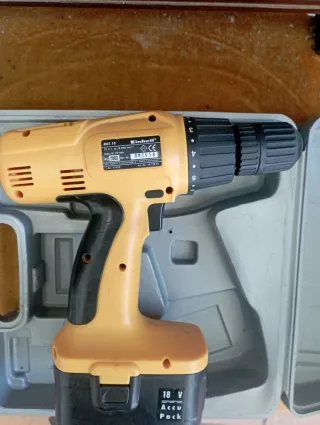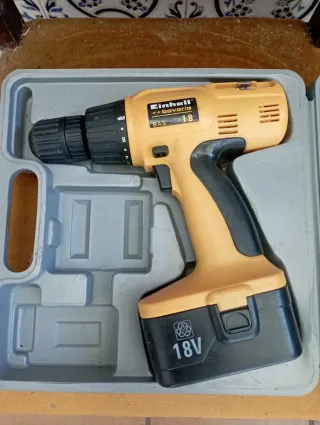 Se dejó parado hace años por no encontrar el cargador, funcionando bien ahora seguramente la batería no funciona Taladro percutor inalámbrico E lainhell Bavaria. - Modelo: BAS 18. - Voltaje: 18V. - Color: Amarillo y negro. - Incluye maletín de transporte.