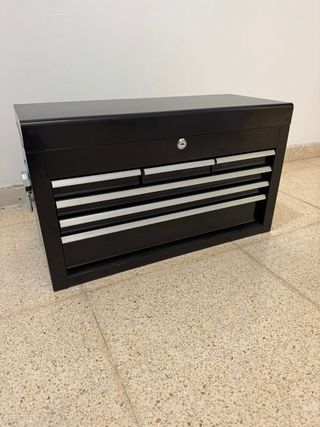 Caja de herramientas de color negro con varios cajones. - Diseño moderno y funcional. - Tiradores plateados. - Cerradura central.