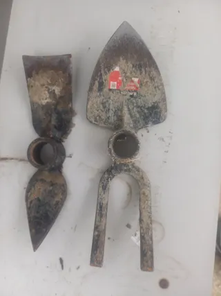 Conjunto de dos herramientas de jardinería, ideales para trabajos en el huerto o jardín. - Una herramienta tipo azada con forma de pala. - Otra herramienta tipo azada con forma de pico. Sin mango