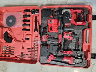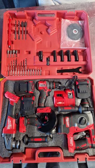 Kit de herramientas Milwaukee en perfecto estado sin uso,las herramientas van muy bien y la batería aguanta bastante tiempo - Taladro percutor. - Amoladora angular. - Rotomartillo. - Variedad de brocas y accesorios. - Baterías y cargador incluidos.