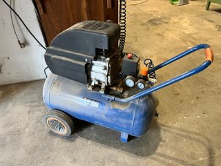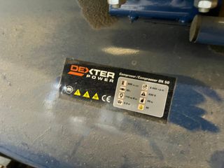 Compresor de aire Dexter modelo DX 50. SOLO VENTA EN PERSONA - Potencia: 2,5 CV. - Capacidad del depósito: 50 L. - Caudal de aire: 205 L/min. - Presión máxima: 8 bar. - Voltaje: 230 V. - Velocidad de rotación: 2.500 rpm. - Peso: 35 kg.
