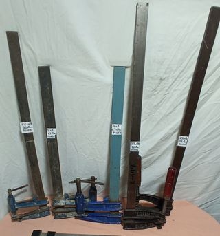 Lote de sargentos para carpintería y trabajos similares. Incluye varias unidades de diferentes tamaños y marcas. Precio 150 e. los cinco. Las medidas vienen en la foto - Sargentos marca PIHER. - Sargentos marca HURKO. - Medidas variadas: 92cm, 63cm, 78cm. - Materiales metálicos.