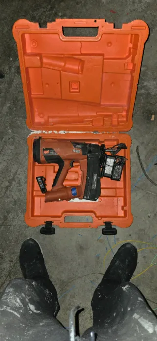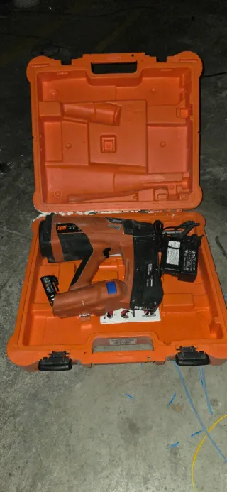 Clavadora a gas SPIT Paslode en su maletín original. - Incluye batería. - Maletín naranja de plástico resistente.
