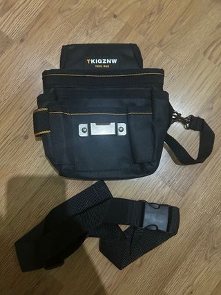 Práctico cinturón de herramientas de la marca TKIGZNW. - Color negro. - Diseño con múltiples compartimentos. - Cierre metálico frontal. - Anilla lateral para colgar. Nuevo a estrenar precio negociable