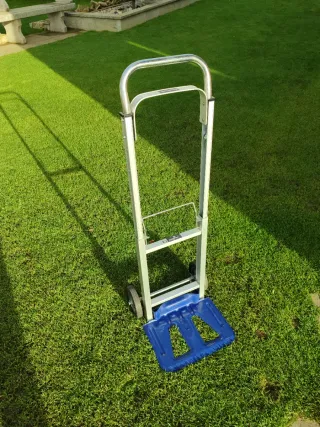 Carro de mano plegable de la marca Einhell, ideal para transportar objetos. Nunca se llego a usar. - Estructura de aluminio. - Base de carga azul. - Ruedas para facilitar el desplazamiento.
