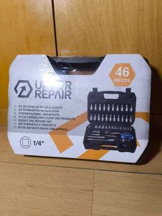 Maletín compacto con juego de puntas y accesorios de carraca 1/4, nuevo sin abrir. - Incluye puntas de diferentes tipos y tamaños. - Carraca con mango ergonómico y destornillador.