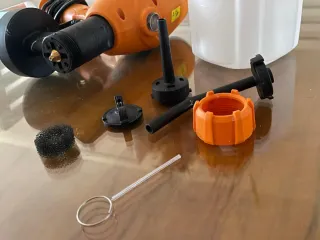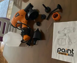 Pistola de pintura con varios accesorios incluidos para diferentes usos. Del Lery Merlin. - Incluye recipiente para pintura. - Boquilla y filtro. - Herramienta de limpieza. Solo lo he utilizado una vez pero no me sirvió porque era un mueble interior y manchaba todo alrededor. Funciona perfectamente pero seguí con pincel jejeje.