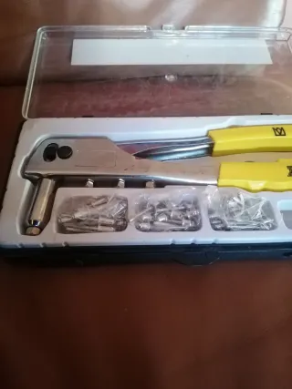 Set de alicates para remachar con varios tipos de remaches. - Alicates de metal con mangos amarillos. - Incluye remaches de diferentes tamaños.