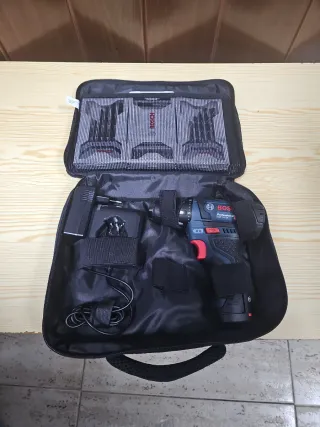 Se vende atornillador Bosch en su maletín de transporte. Incluye cargador,1 bateria,kit brocas,puntas.No negociable. - Maletín de tela con compartimentos. - Cargador de batería. - Atornillador eléctrico Bosch.