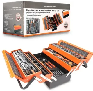 Caja de Herramientas, nueva sin usar: 85 herramientas y accesorios esenciales de Cromo Vanadio, que incluyen una variedad de destornilladores, llaves, una cinta métrica y una amplia gama de tornillos y fijaciones, etc. Material: Las herramientas son de Cromo de Vanadio un material profesional y la caja está fabricada con metal y con un acabado de pintura, son materiales tanto duraderos como resistentes a la corrosión.