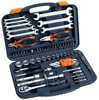 MALETIN CON HERRAMIENTAS COMBINADAS 83 PIEZAS ALYCO 170765 Maletín rígido de pequeño tamaño con multitud de herramientas de apriete en distintas modalidades (llaves, llaves hexagonales, alicates, puntas de atornillar, vasos hexagonales) Herramientas en Acero al Cromo- Vanadio, lo que les da dureza y larga vida, no redondeandose los cantos El acabado por tratamiento térmico y cromado evita la oxidación y alarga la vida y efectividad de las llaves El maletín esta especialmente diseñado y estan perfectamente preparados los orificios para las herramientas, pudiendo controlar las herramientas que faltan. Maletín de plástico rígido,...