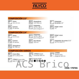 JUEGO LLAVES DE VASO DE 1/2", 1/4" Y 3/8" DE 171 PIEZAS ALYCO 170745 Capacidad de apriete casi infinito de tuercas hexagonales (desde 4 hasta 32 mm.) y aprietes de ranura, PH, PZ, Torx, etc. con puntas. Conjunto de herramientas de apriete mediante vasos hexagonales con 3 carracas, de cuadradiillo de 1/4", 3/8" y 1/2", y vasos desde 4 a 32 mm, apto para infinidad de tareas de apriete. Carracas de muy fácil manejo, y larga vida. Muy aptas para mantenimiento industrial, taller de automoción, incluso para bricolaje casero. Gran trasmisión del esfuerzo, por las capacidades de las carracas de mecanismo preciso de 72 dientes, acodada...
