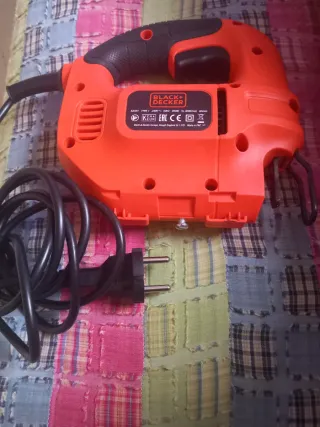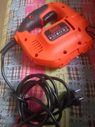 Sierra de calar de la marca Black+Decker en color naranja. - Le falta la parte de abajo. - Mango ergonómico. - Cable de alimentación incluido.