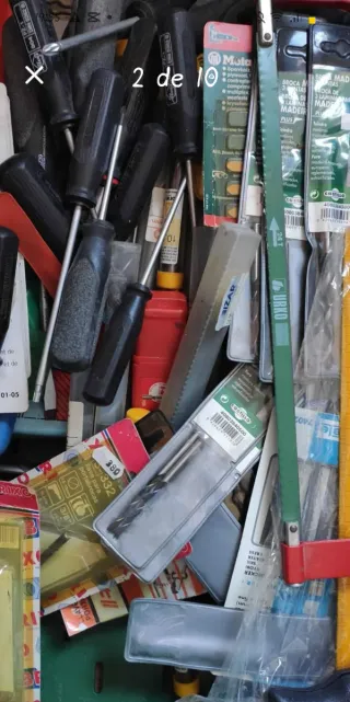 Lote de ferretería compuesto por: 1 escuadra 7 paquetes sierras caladora 3 limas 25 destornilladores 6 llaves portabrocas 3 discos tyrolit 32 brocas de punta para madera medidas 5,8 y 10 9 brocas para hormigón 102 brocas N3 1/8 TOTAL 190 PIEZAS TODO SIN USAR Y MARCAS ESPAÑOLAS.