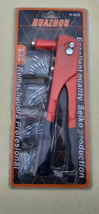 Remachadora profesional de la marca Huazhou, modelo H-608. Incluye remaches. - Cuerpo de metal naranja y negro. - Incluye 240 remaches de diferentes tamaños. Nueva a estrenar